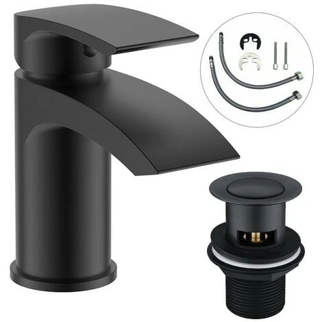 Matt Black Curve Waterfall Cloakroom Basin Mixer Tap Sink Mono Bathroom + Waste