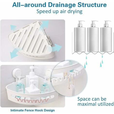 No-Drilling Installation: No need to drill holes and denature the wall of the corner shower shelf, also use the tools to install this suction cup shelf. Just choose and clean a slippery surface, peel off the protective film and press Put them together. The suction cup will deflate all the air until you hear a boof sound. Even kids can install this bathroom storage, which has excellent durability, temperature resistance (-4°F-174°F), water, moisture, oil and aging .The thick ABS shower tray can load 10kg and keeps the sliding surface well for a long time.Drainage and adjustable hook design: Drainage holes to maximize ventilation and water flow make your bathroom accessories clean.Can adapt to any angle position of your m season.< br / > Multipurpose: This shower caddy offers you the best organizational solution for bathroom, kitchen, basement, office or RV to store shampoos, To transport sponges, soaps, bathroom accessories, kitchen utensils, etc. Hooks on the caddy for hanging towels and brushes.