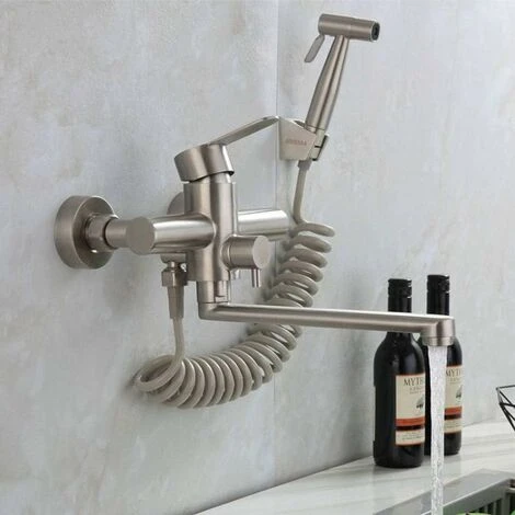 wall-mounted kitchen tap: Spout of the faucet is inclined ±15° and swivels 360°, ideal for your double bowl sink, easy to switch from one bowl to another, you easily wash all the corners of the kitchen